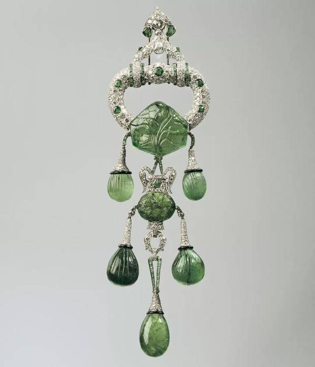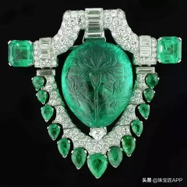 这只巨大壕气的胸针,由7颗大小不一的雕花印度祖母绿所组成,其中最大的一颗可以追溯到17世纪。总重量达到250克拉,表面覆有珐琅,并用钻石进行镶嵌,十分精美。