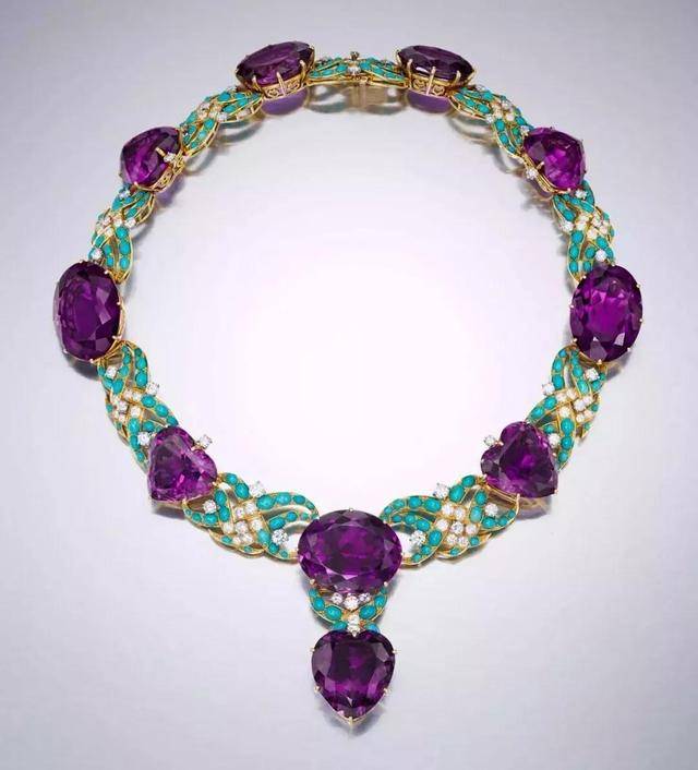 这条制作于1950年的卡地亚紫水晶项链,是由不同大小和形状的紫水晶组成,水晶与水晶之间,选用绿松石和钻石进行点缀。