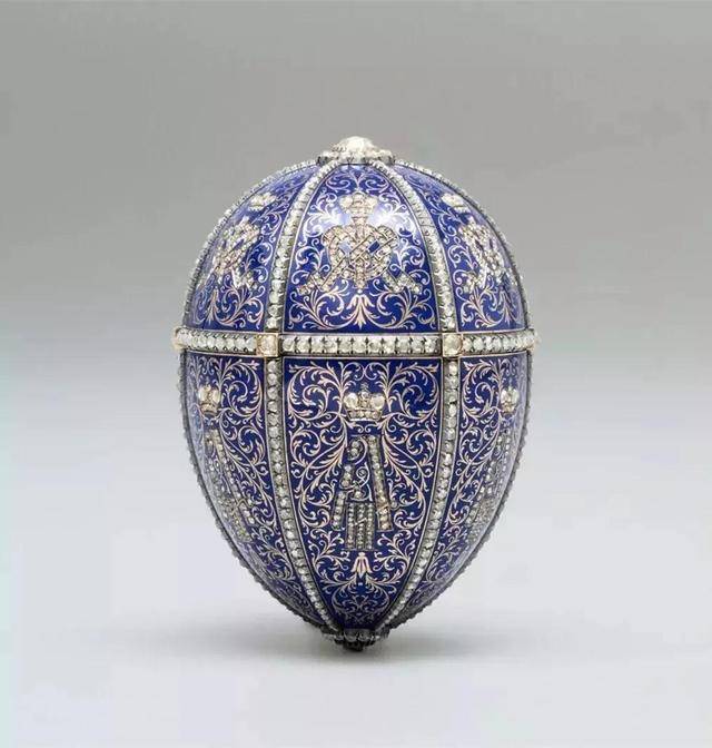 当时亚历山大三世刚刚去世不久,尼古拉二世命法贝热制作了这款以深蓝色珐琅为背景的彩蛋,并用钻石将彩蛋分成12个面,每个面上都有夫妻二人名字的缩写,是玛利亚悼念亡夫的最好的纪念礼物。
