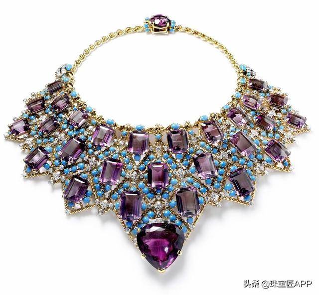 Draperie 金质项链,by 卡地亚Cartier,1947年,镶嵌紫水晶、绿松石、钻石,专为温莎公爵夫人设计。