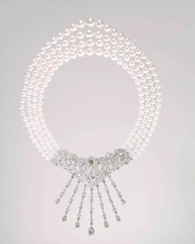戴上以后,从前面看,是4股珍珠项链,从背面看,则是由钻石、钻石镶嵌的流苏卡扣,这款设计看似简单,却十分凸显佩戴者的气质。