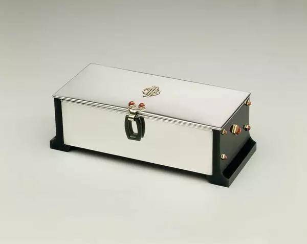 下面这款1935年制作而成的,镶嵌玉石和珊瑚的银质盒子: