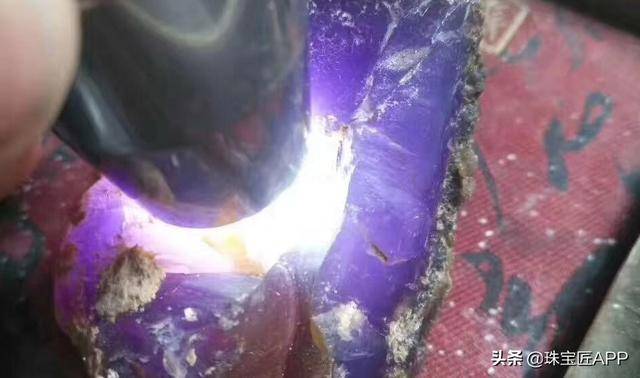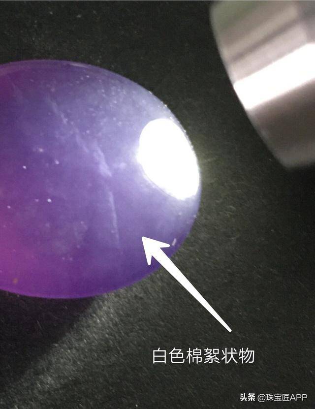 “保山冰紫料":虽然名字带“冰”,但打光观察结构并不是隐晶质,有浑浊的白色棉絮。