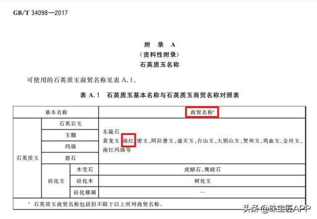 而在现行国标GB/T 34098-2017《石英质玉 分类与定名》中,南红作为商贸名称的一种出现。
