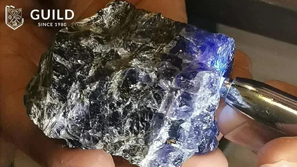 在用反射光观察时,原石颜色常常过深;而用透射光观察则呈现出深蓝色。摄影:Andrew Lucas;版权属Guild宝石学院