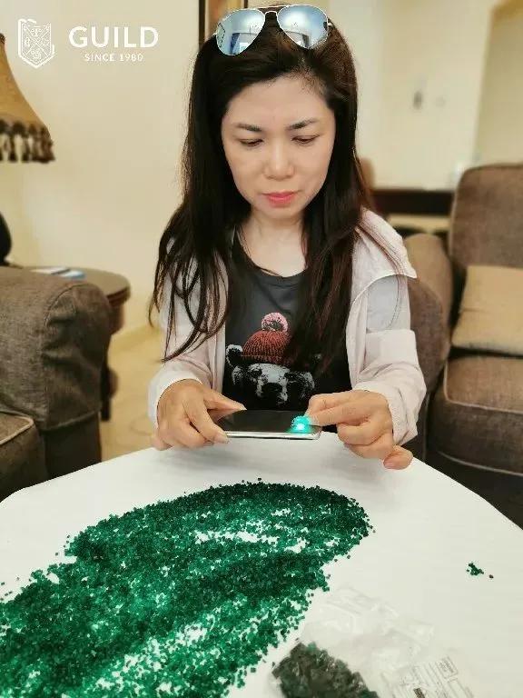 Ruby Liu女士正在检查一大包阿富汗宝石商提供的巴基斯坦斯瓦特地区的优质祖母绿原石。