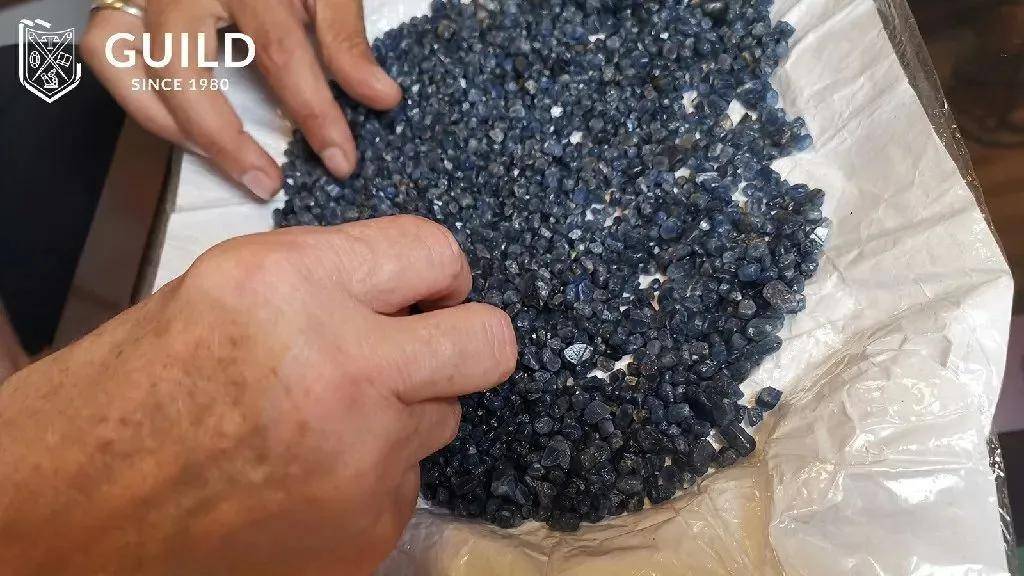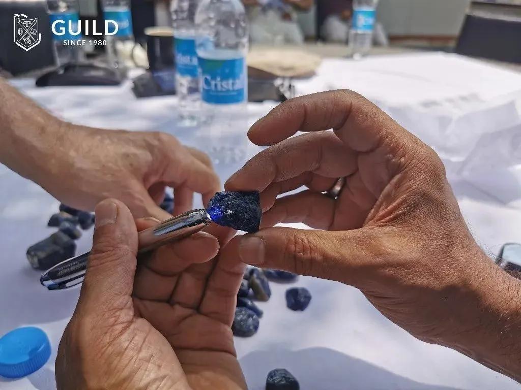 阿富汗宝石商人们在阿富汗喀布尔和迪拜向Ruby Liu和Andrew Lucas先生展示了来自巴达赫尚(Badakhshan)的蓝色蓝宝石。摄影:Andrew Lucas;版权属Guild宝石学院