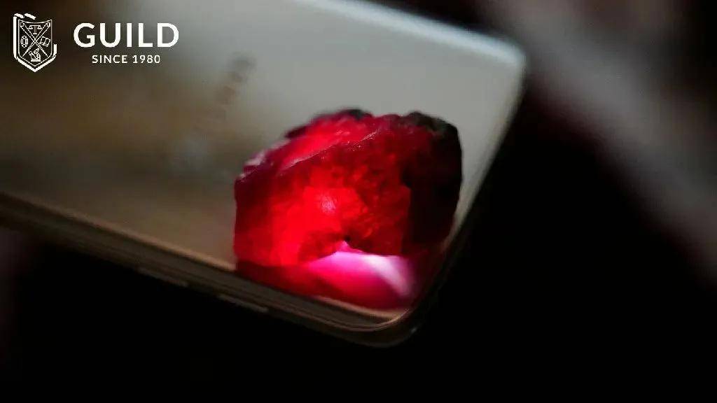 透过手机手电筒的强光,这颗塔吉克斯坦红宝石尽管透明度不够,但其颜色浓郁明艳。