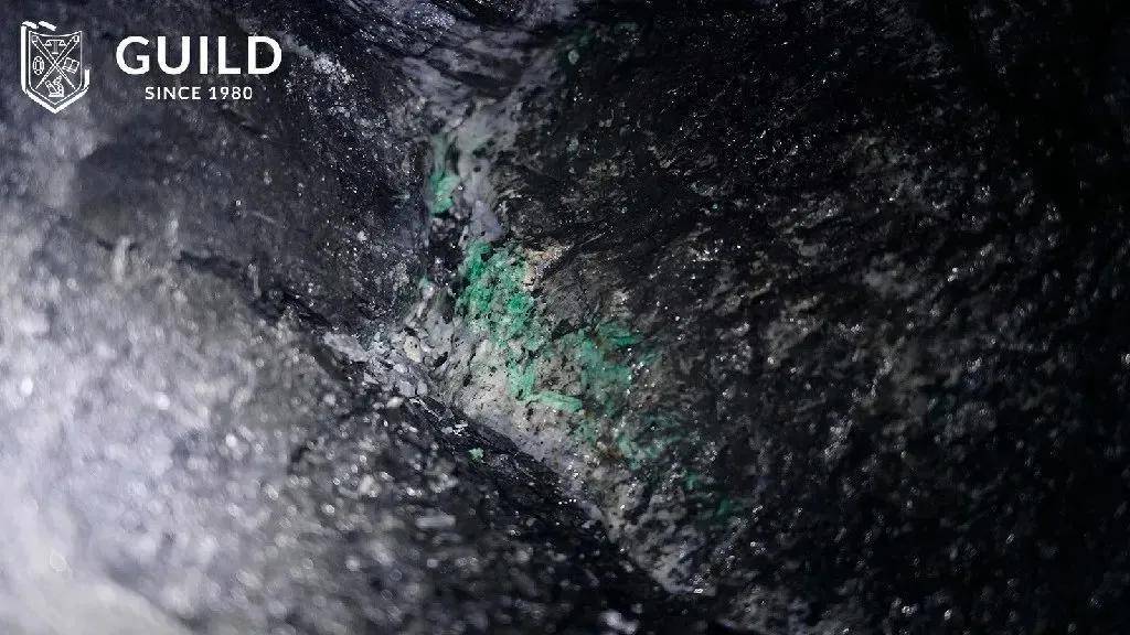 矿道壁上的祖母绿。摄影:Andrew Lucas;版权属Guild宝石学院