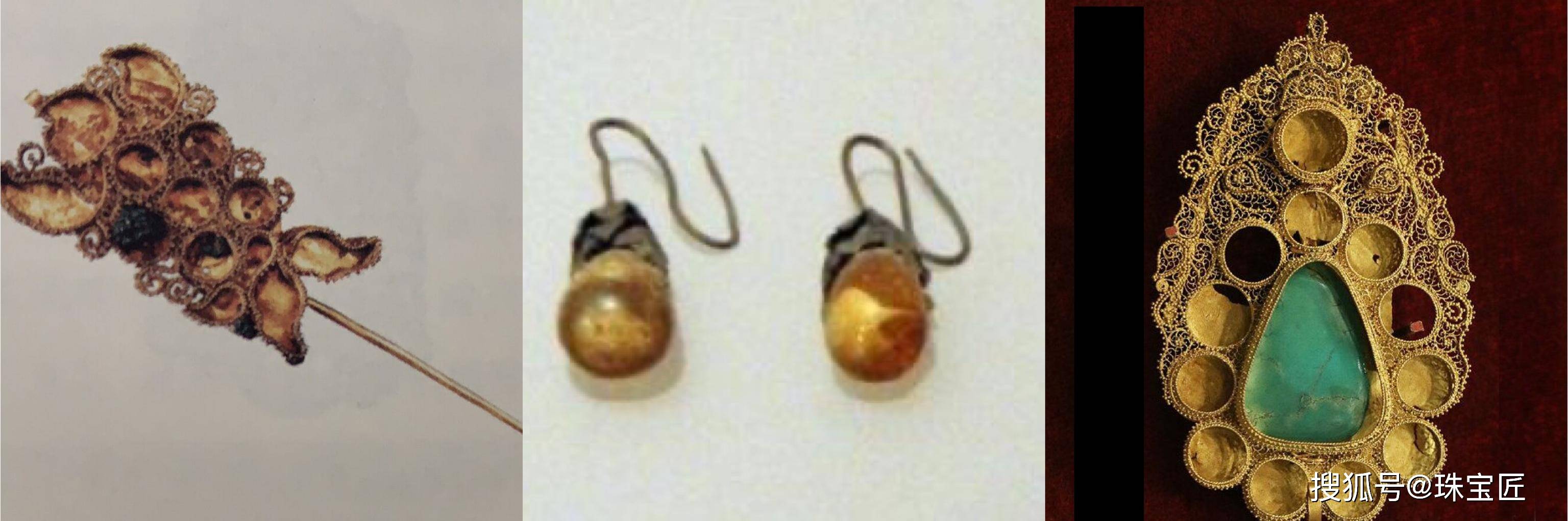 左:金累丝蝴蝶桃花纹嵌宝耳环 中:银镶琥珀茄形耳环 右:金累丝嵌宝莲塘小景纹塔形葫芦环