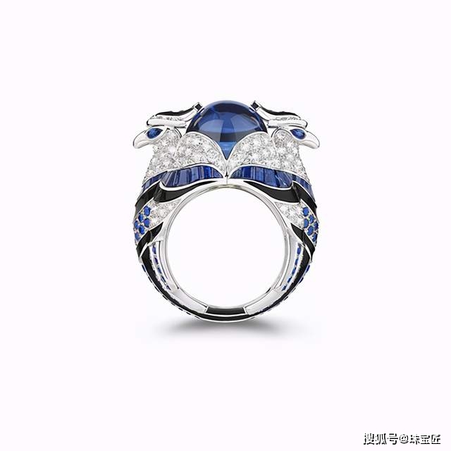 宝诗龙Animaux动物系列中的Meisa山雀戒指,碎钻、水晶、沙弗莱、青金石、缟玛瑙镶嵌的小鸟对面,正对着一枚大尺寸奢华的坦桑石。造型别致,整体风格又很协调。