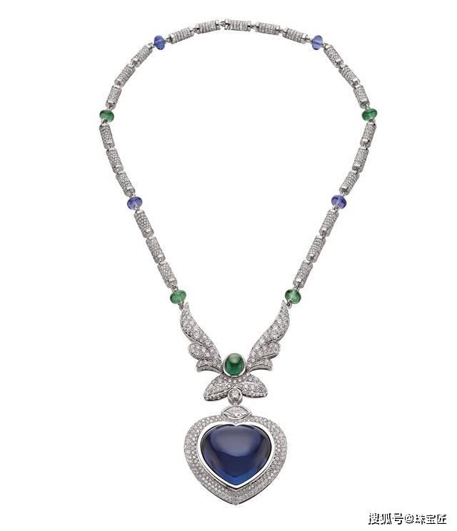 除此外,BVLGARI高级珠宝系列“Wild Pop”中的其中一条项链“Pop Heart”主体部分为也是一颗重达53.80克拉的心型弧面坦桑石。