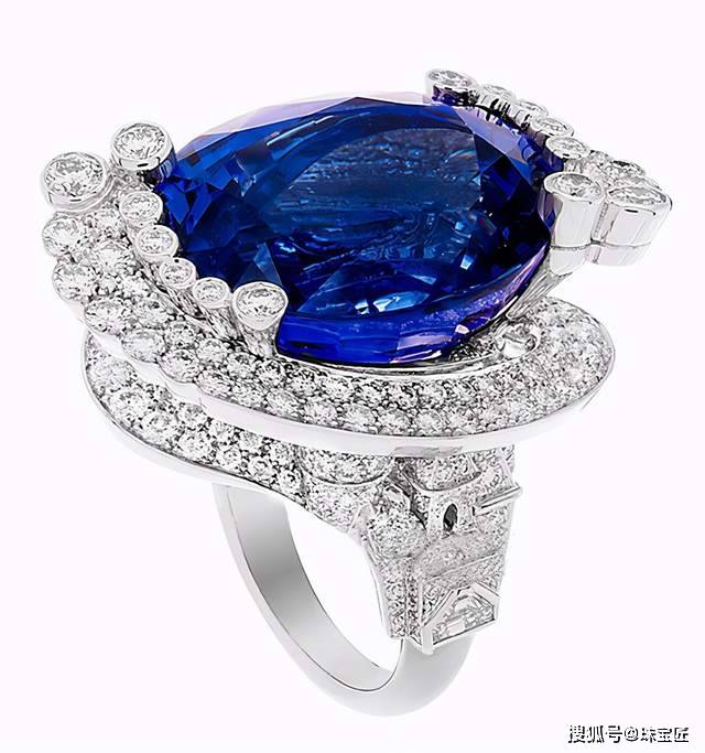 Van Cleef & Arpels可以查到的坦桑石珠宝并不算多,下面这枚硕大的Van Cleef & Arpels坦桑石白金戒指颜色浓郁,晶体纯净。