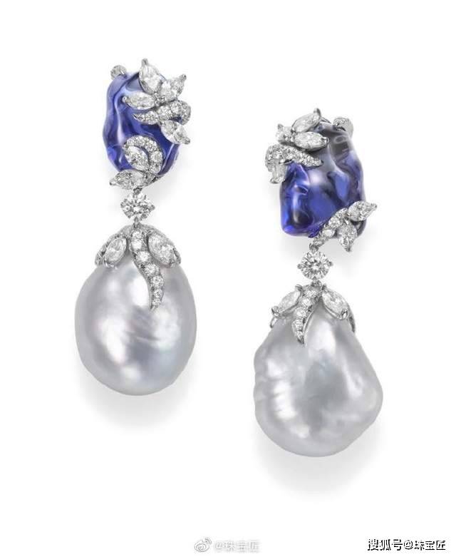 下面这对耳钉简直是把珍珠与坦桑石结合设计的典范——以养殖巴洛克海水珍珠和随形坦桑石为主石,设计灵动个性又优雅。