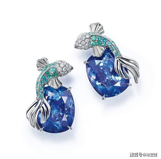 Blue Book 的坦桑石耳饰中,下面这对耳钉也非常美妙,垫形切割的坦桑石如一汪深邃的水,鱼儿徜徉在其上方,给人一种清爽幽静的感受。