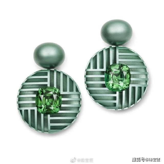铝质耳坠,by Hemmerle | 镶嵌2颗15ct的枕形切割绿色碧玺,镶座由阳极氧化铝和白金制作。