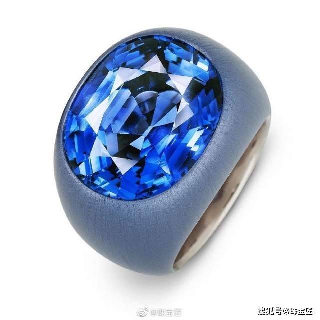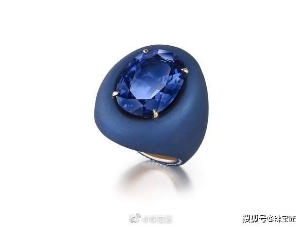 铝质戒指,by Hemmerle | 镶嵌一颗18.9ct的枕形切割蓝宝石,产自缅甸,戒托由阳极氧化铝和白金制作。