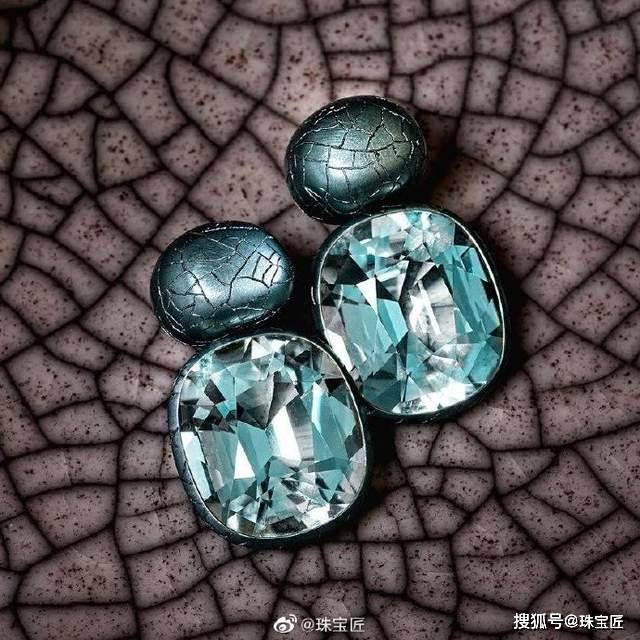 铝质耳坠,by Hemmerle | 镶嵌2颗枕形切割海蓝宝石,镶座由阳极氧化铝制作。