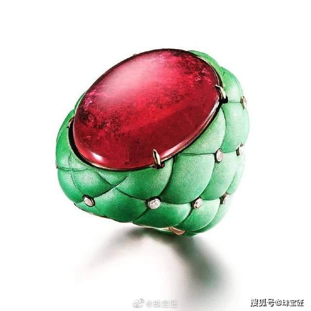 Chesterfield 戒指,by Suzanne Syz | 主石为红碧玺,点缀圆形切割钻石,戒托由电镀铝材质和黄金制作。