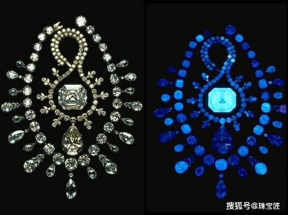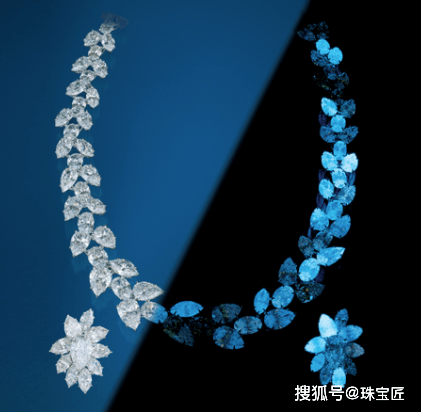 钻石项链耳环套装,左边正常光线下,右边紫外光下 | 图源:GIA