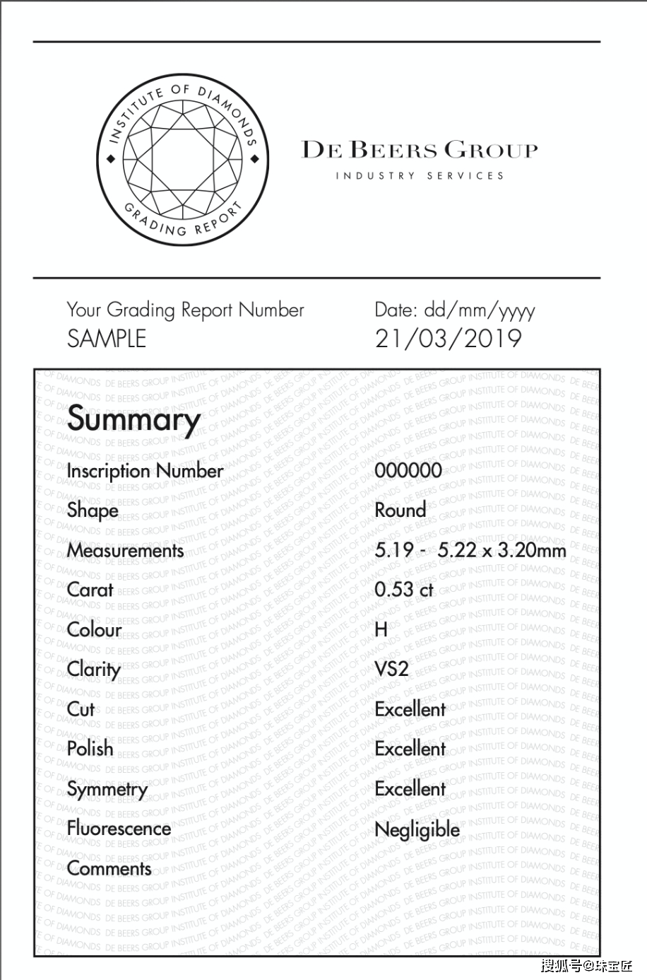 GIA证书中对荧光等级描述的第一级是无荧光,而钻石大佬戴比尔斯旗下的检测机构,也有出具钻石证书(DBGIS证书)。他们的证书中,荧光等级的第一级,写的不是None(无),而是Negligible(可忽略不计的)。