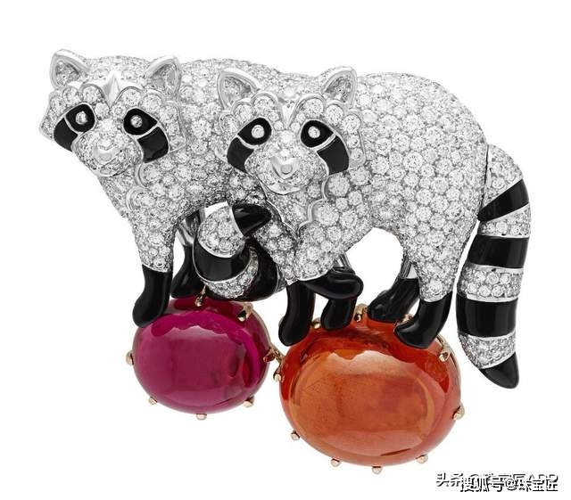 Van Cleef & Arpels 的浣熊白金胸针,镶嵌了锰铝榴石和粉碧玺、钻石和缟玛瑙。