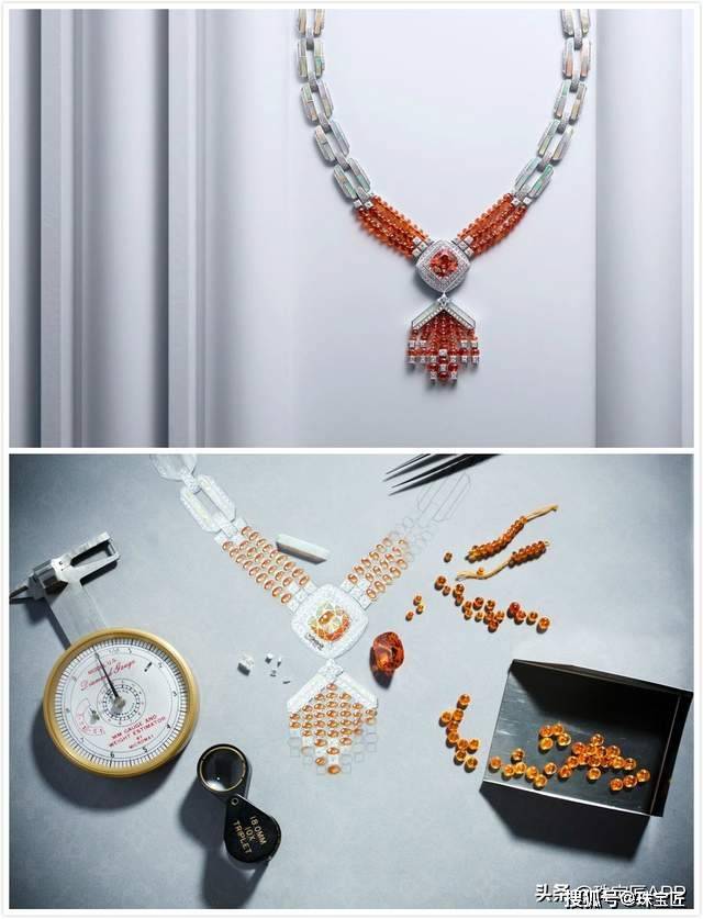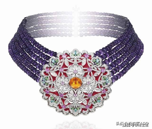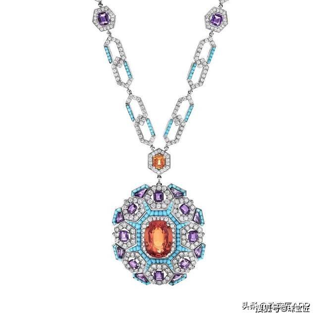 而 Bulgari的Night at the Casino 锰铝榴石白金项链,在紫水晶与绿松石的经典撞色中增添了芬达石榴石亮丽的橙色。