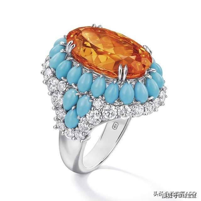 芬达石榴石是一种超级适合做撞色设计的宝石, Harry Winston的这枚芬达石榴石和绿松石撞色的戒指是最好的示范。