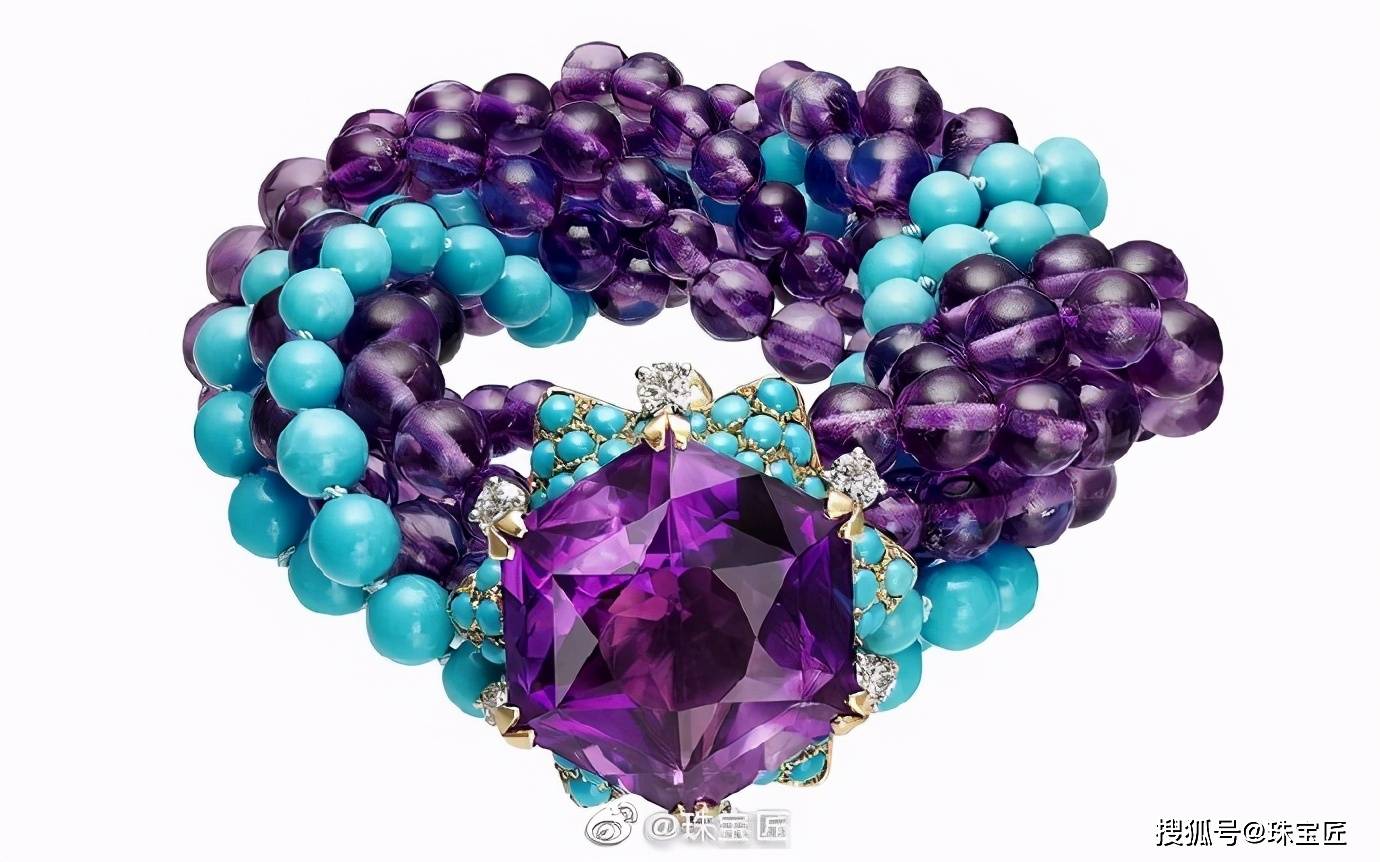而下面这条手链便是为了搭配上面的项链而制作的,是1954年温莎公爵赠送给辛普森夫人的圣诞礼物,同样大面积使用紫水晶和绿松石点缀搭配。