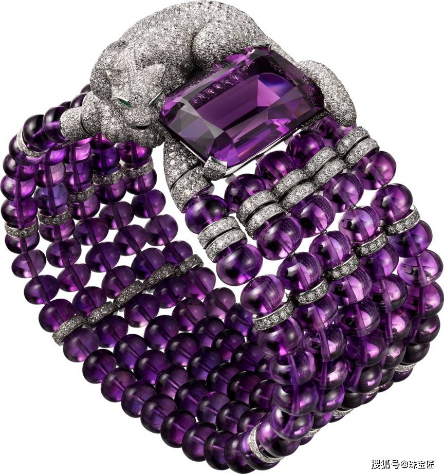 提到Cartier,怎能没有“豹子”出场呢,满钻的猎豹匍匐盘踞在紫水晶多层手链上,贵气逼人又华丽复古。