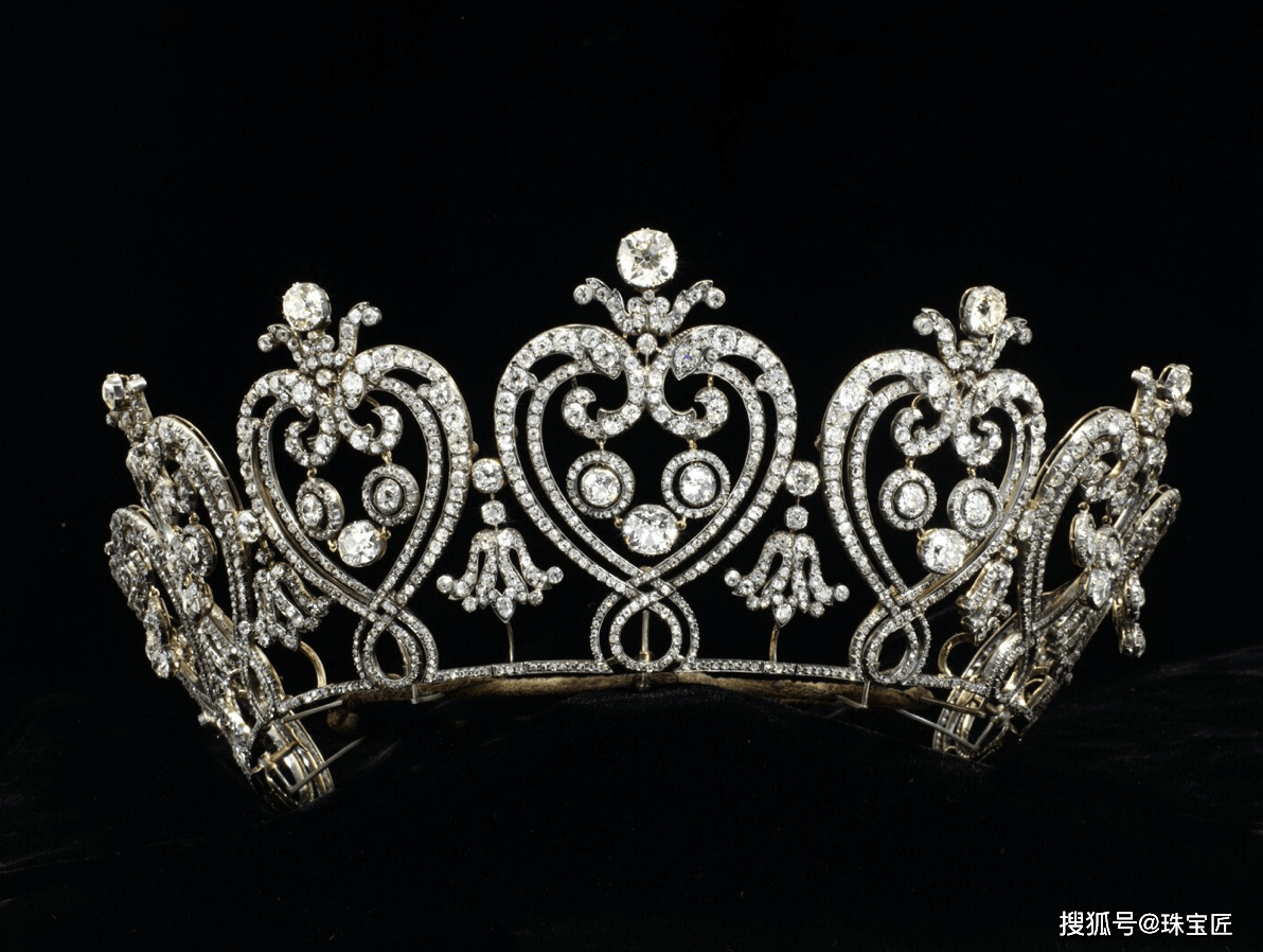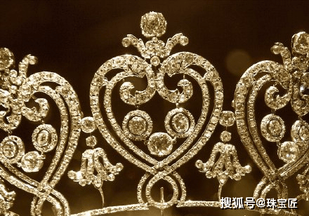 相对于其他冠冕,这顶冠冕最为独特之处在于,心形中间3颗钻石采用悬空设计,随着主人的行动,摇曳生辉。