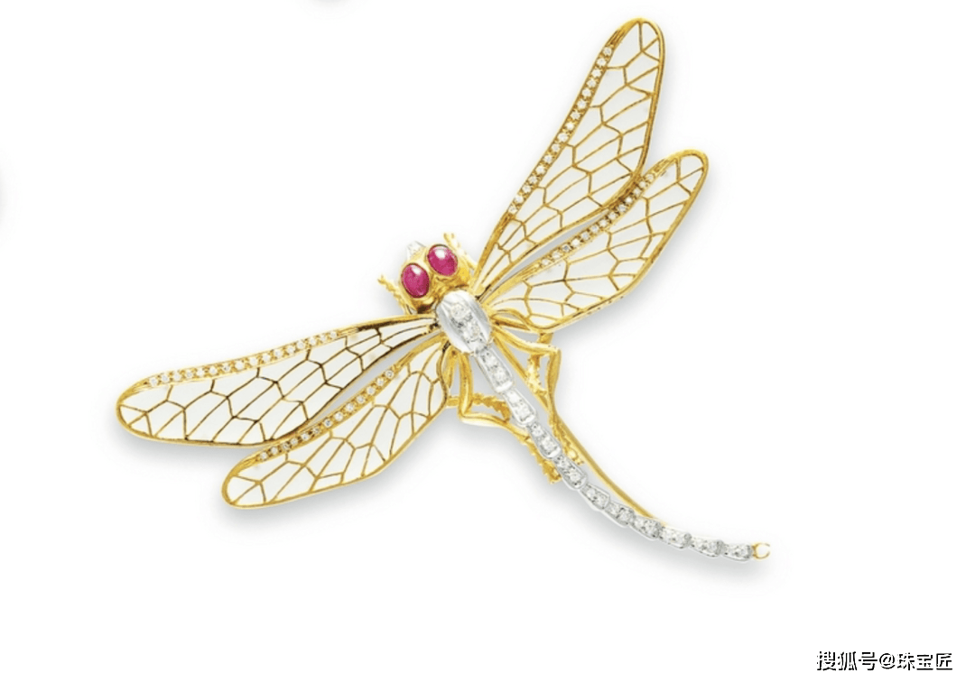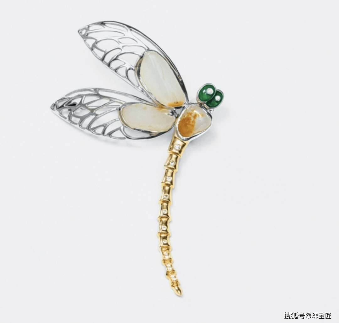 在昆虫元素中,蜻蜓以宽大轻盈的双翼、纤细修长的身体独树一帜,寓意亭亭玉立,在珠宝里是胸针的好素材——用金不多,看起来还显大。
