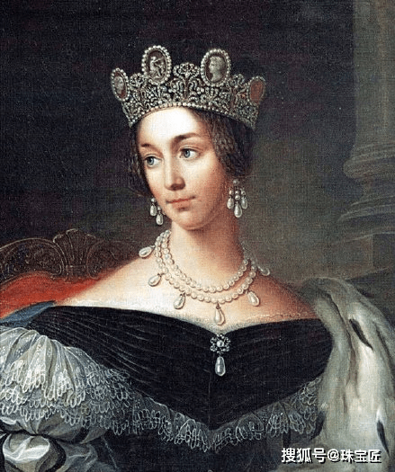 约瑟芬娜皇后佩戴珍珠浮雕冠冕以及珍珠项链、耳饰