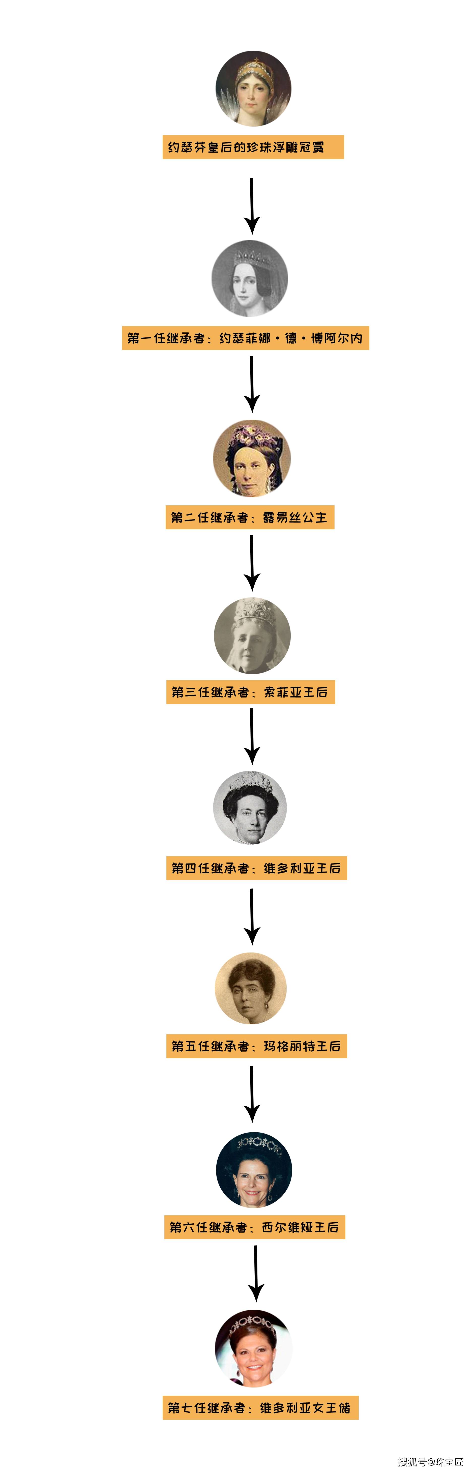 这顶冠冕历经岁月,分别由历代国王的王后(荷兰露易丝公主→索菲娅王后→索菲·玛丽·维多利亚王后→玛格丽特王后→西尔维娅王后)继承。