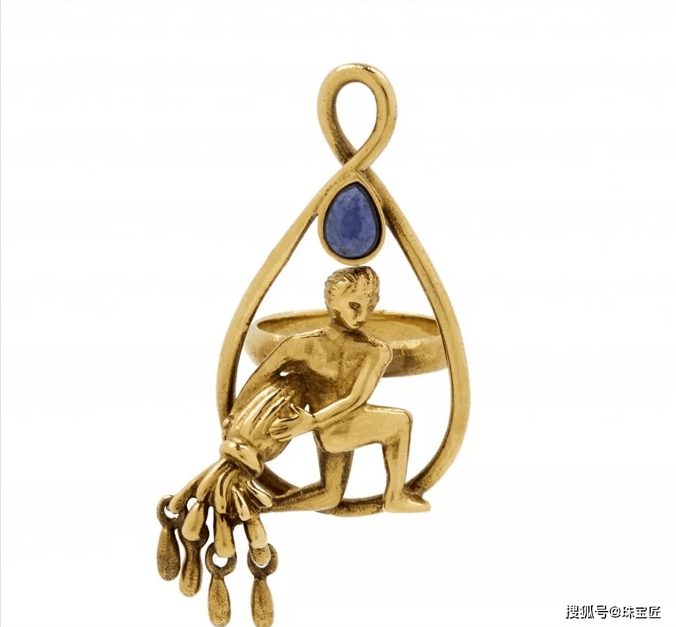 由黄金打造的小人手中捧着水瓶,吊坠的上方镶嵌了一颗蓝线石,华丽中带有一丝古典。