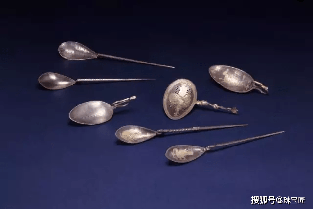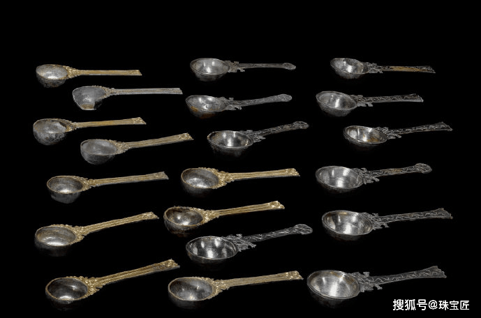 除了胡椒瓶,还有上百只样式各异的银汤匙,勺柄上饰有精致的纹样,有的勺子上还刻有头像、动物等造型;