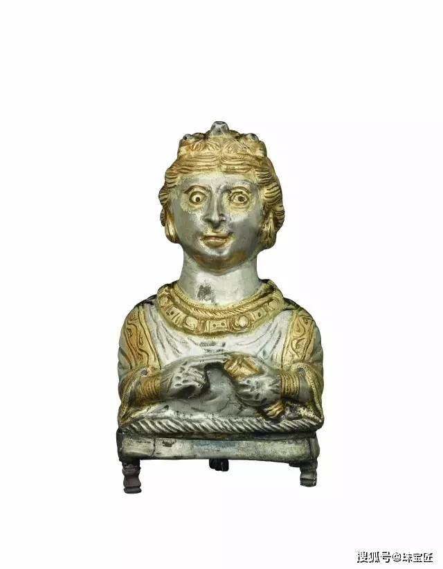 这个胡椒瓶高约10厘米,上面雕刻的罗马贵妇身着华服,发饰繁复,手中拿着金色卷轴,表情端庄,在其眼睛、耳朵、头发、颈饰、服饰上都镀有黄金。