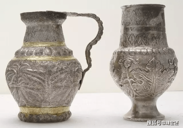 瓶身上饰有纹样的银质器皿,款式新颖,大气奢华。
