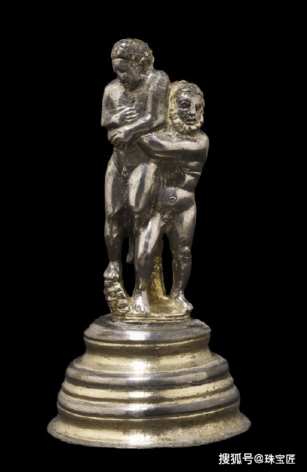 而下面这枚胡椒瓶与上面的略有不同,主体为赫拉克勒斯和安泰俄斯像,盛放香料的地方则位于下方台座上。