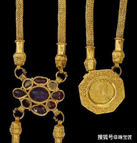 链条为X型,中间嵌有紫水晶和石榴石,部分格子上的宝石有所缺失,背面坠有一枚印有头像的钱币,链条的工艺精湛繁复,款式新颖,极为奢华。