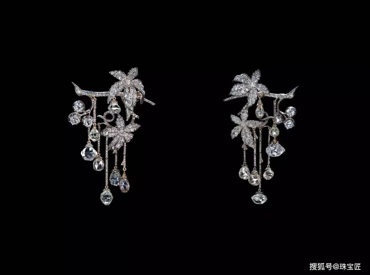 而这对镶有印度戈尔康达美钻的发饰,即可作为胸针点缀于胸前,也可作为发饰佩戴在头上,这种将自然之美展现的淋漓尽致的花形珠宝,曾是那个时代淑女们参加舞会时最喜爱的款式之一。