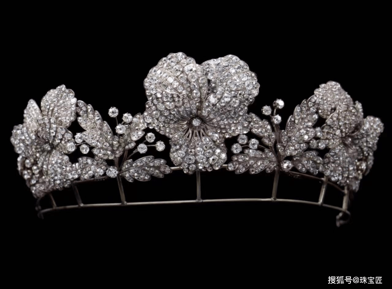冠冕的特别之处在于,主体部分可以被拆分为3个胸针,三朵三色堇与样式各异的叶子交织,造型新颖,款式唯美,曾是当时最受欢迎的冠冕款式之一。