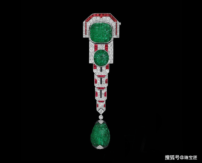 这款于20世纪20年代创作的雕刻祖母绿装饰胸针,红绿白的经典搭配,简单立体的几何线条,获得美国艺术收藏家莉莉安·铁姆肯夫人的钟情,成为了CHAUMET装饰艺术风格的代表作。