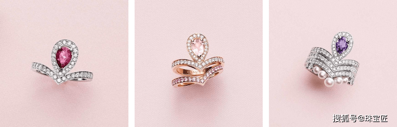 海蓝宝、珍珠等颜色各异的宝石与闪耀夺目的钻石相呼应,标志性的水滴图案,巧妙的叠戴设计,打造出一枚独属于你的Joséphine约瑟芬系列戒指。