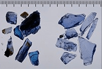 长波紫外线(LWUV)下照射十分钟后,辐照过的无色方柱石变成蓝色,未经辐照的无色方柱石未变色。
