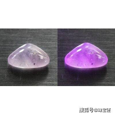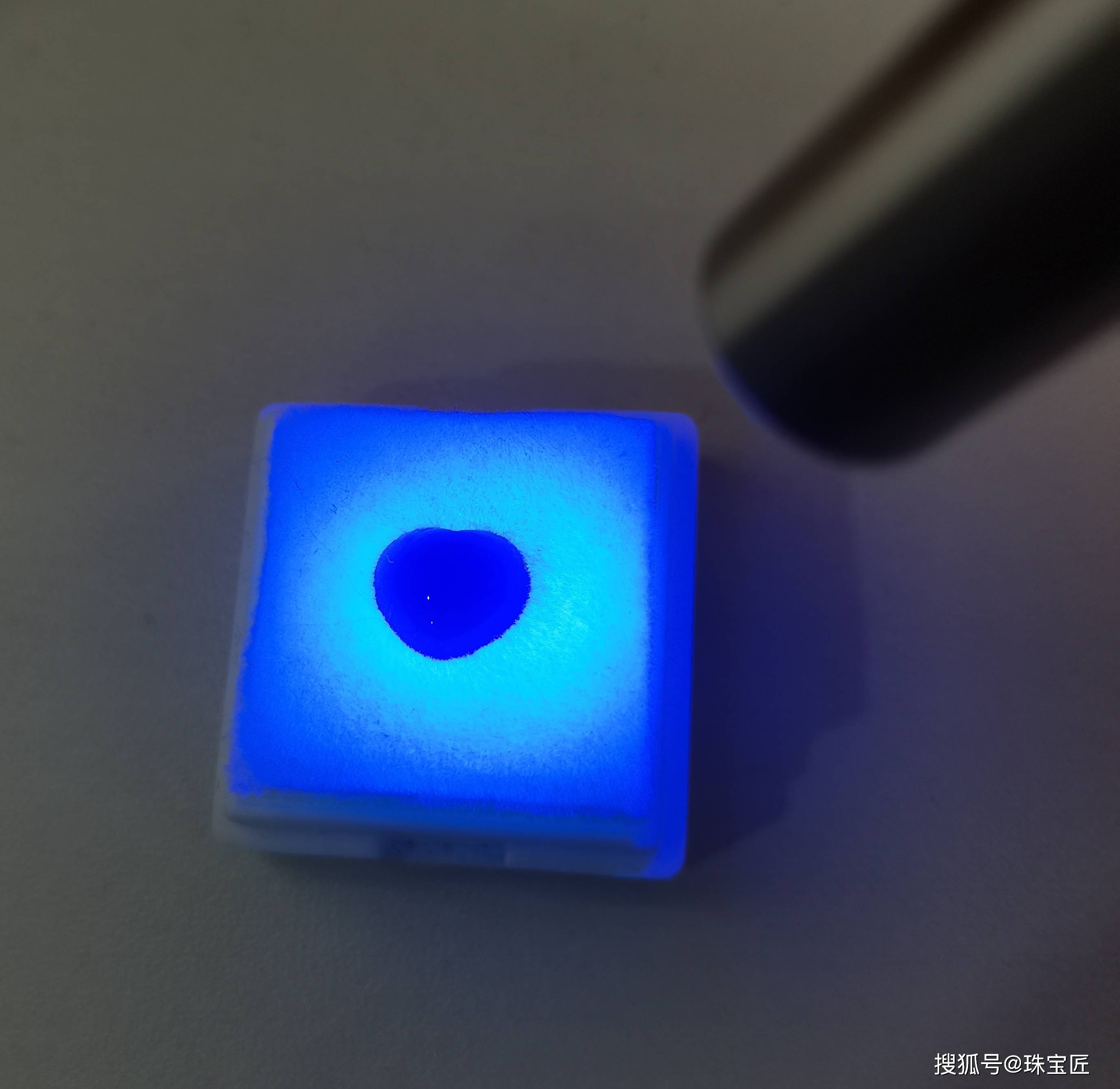 其次,饱和度非常高的深蓝紫色的缅甸产地紫方钠石,和颜色很淡的阿富汗产地的紫方钠石,紫外线照射下的颜色变化都不太明显。