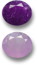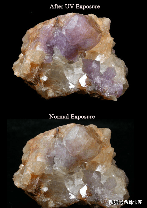 缅甸产地的紫方钠石褪色后(左),紫外光致变色后(右)