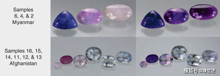 上排为缅甸紫方钠石,下排为阿富汗紫方钠石,图源:《Gems & Gemology》