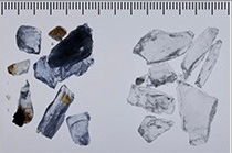 自然光条件下,辐照过的方柱石(左)、天然的方柱石(右)