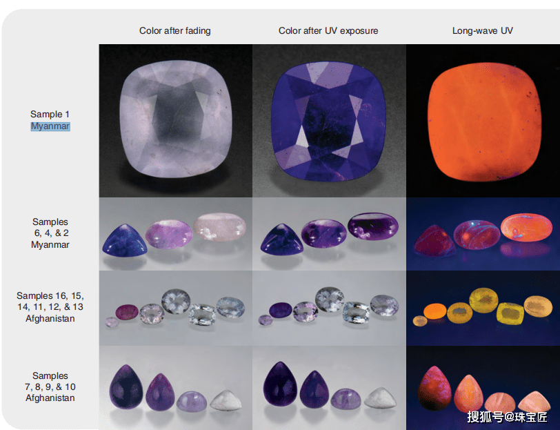 上排为缅甸紫方钠石,下排阿富汗紫方钠石;左为宝石褪色后,右为宝石紫外光致变色后;by《Gems & Gemology》